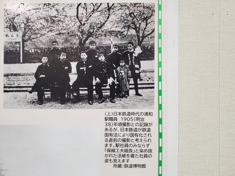 日本鉄道時代の浦和駅職員 1905(明治38) 年頃撮影との記録があるが、日本鉄道が鉄道国有法により国有化される直前の撮影と考えられます。駅社員のみならず「保線工夫組長」と染め抜かれた法被を着た社員の姿も見えます