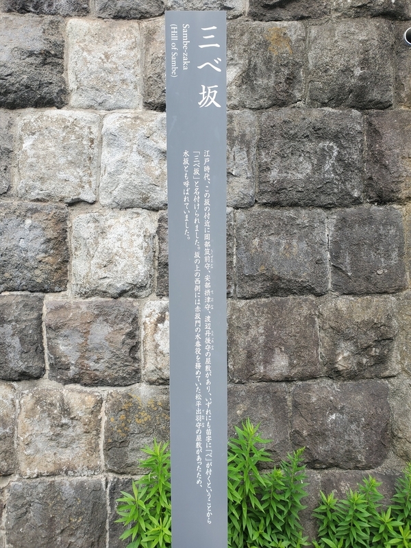 江戸時代、この坂の付近に岡部筑前守、安部攝津守、渡辺丹後守の屋敷があり、いずれにも苗字に「べ」が付くということから「三べ坂」と名付けられました。坂の上の西側には赤坂門の水番役を務めていた松平出羽守の屋敷があったため、水坂とも呼ばれていました。