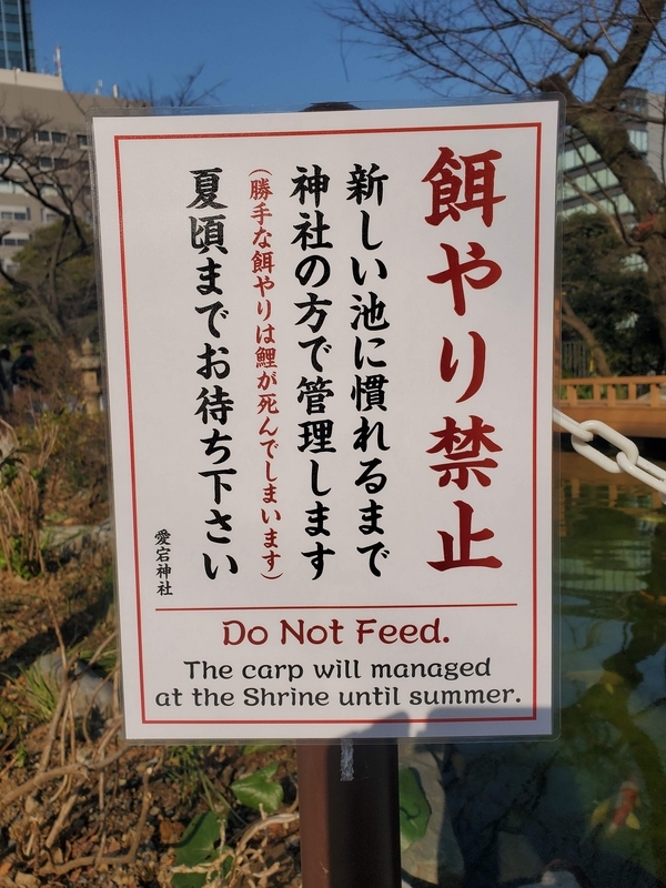 愛宕神社のインスタを見たら、ちょうど3月16日「鯉が長いバカンスから戻って来ました。」と書かれていた。