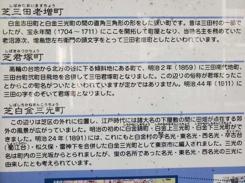 旧町名「芝白金三光町」については、2年以上前のことになるが、下記の記事で紹介したことがある。